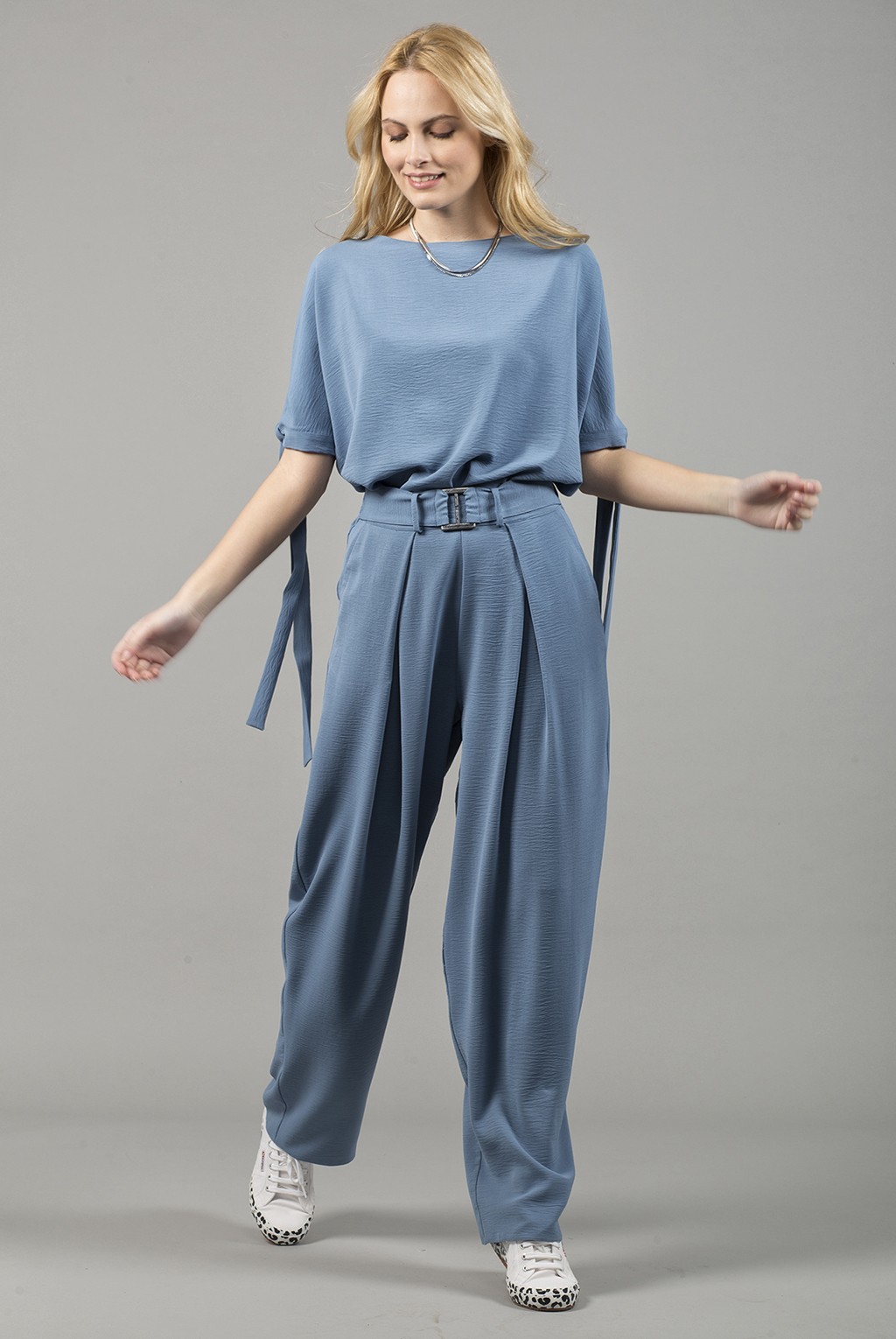Γυναικεία παντελόνα με αγκράφα ελαφρύ ύφασμα, αέρινη σε ίντιγκο απόχρωση με φερμουάρ στο πλάι και πιέτες μπροστά.